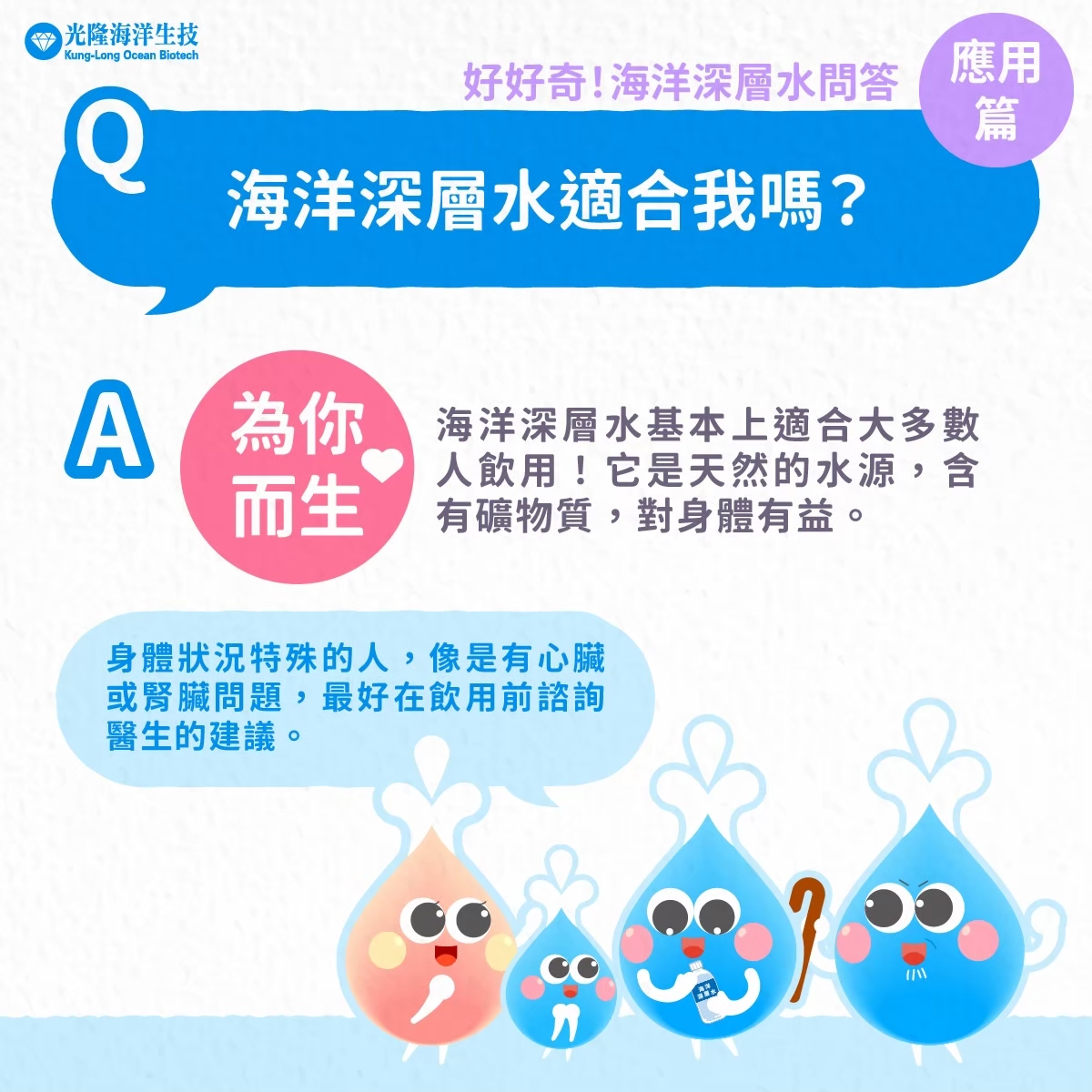 海洋深層水屬於天然水源之一,含有礦物質成分,適合多數人作為日常飲水的選擇。一般情況下,只要依照個人飲水習慣與需求,適量補充水分,即可作為日常生活的一部分。 不同人的身體狀況與生活型態各不相同,對飲水選擇的考量也會有所差異。若本身有心臟、腎臟相關問題,或有特殊健康需求,建議在調整飲水習慣前,先諮詢醫師或專業人員的建議,以確保符合個人狀況。 整體而言,飲水的重點仍在於規律補充水分與維持良好的生活作息,並搭配均衡飲食來理解。