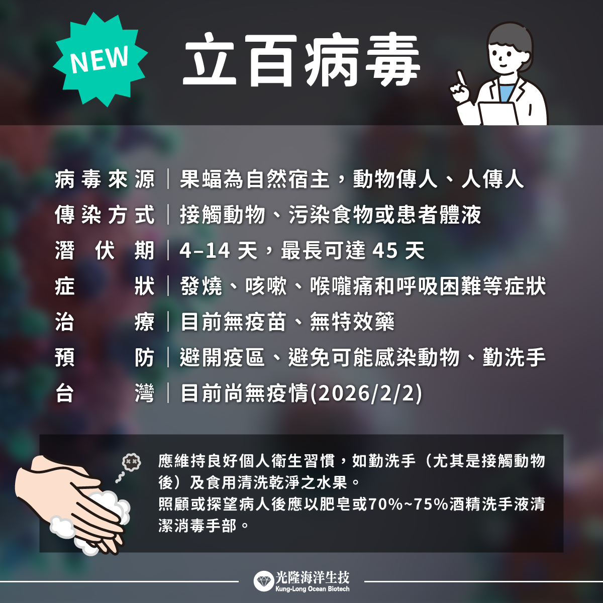 依目前資訊顯示,台灣尚未出現立百病毒疫情,持續關注官方防疫資訊並維持良好生活衛生習慣,有助於降低公共健康風險。
