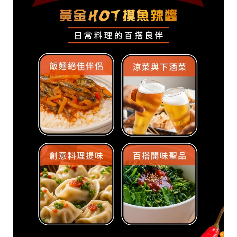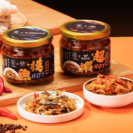 將細膩櫻花蝦的鮮美與榨菜的清脆完美結合,黃金HOT摸魚辣醬為辣醬賦予全新定義!丁香魚的點綴增添海味深度,大紅袍花椒則帶來溫和麻香,